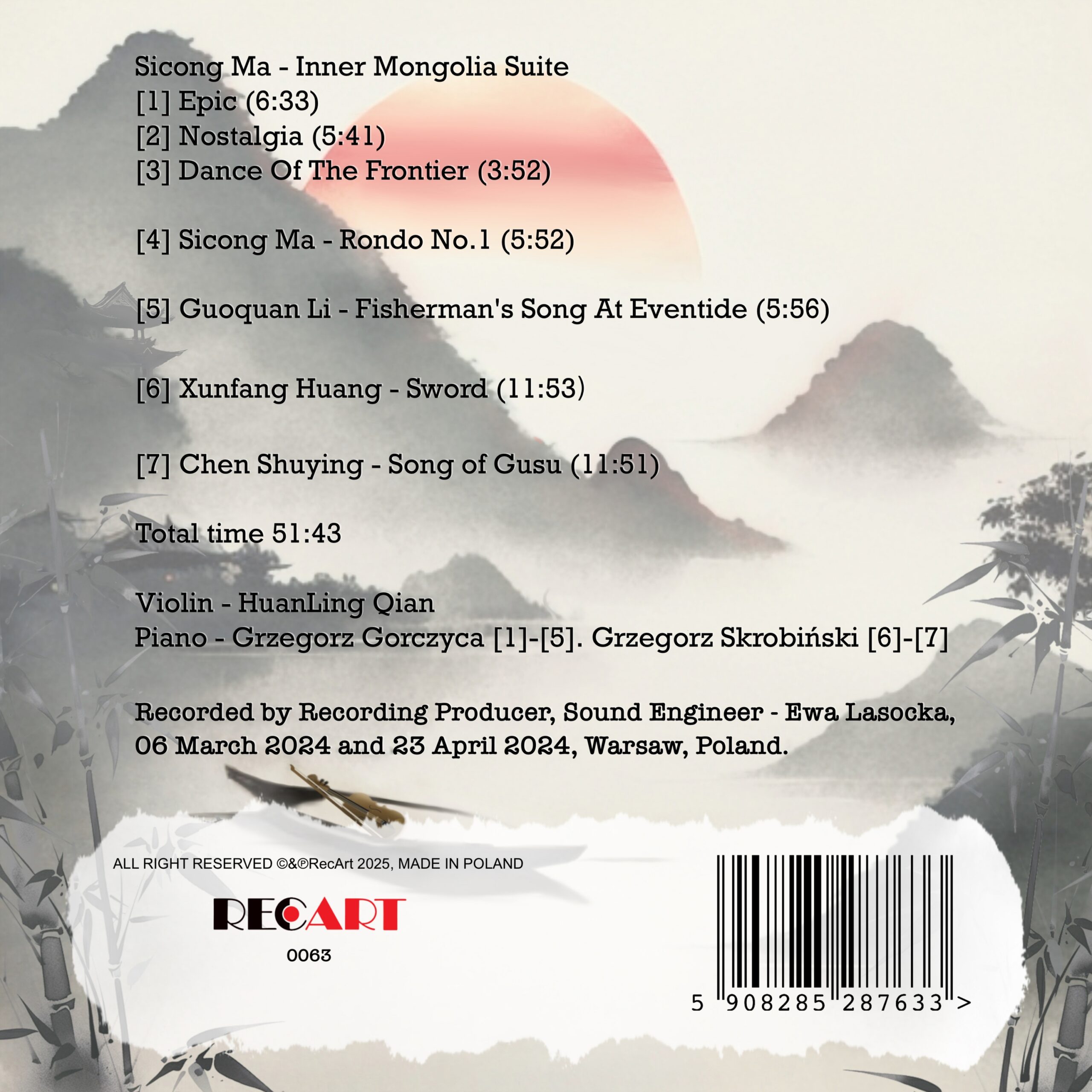 Pochodząca z Chin, ale związana z Polską, skrzypaczka HuanLing Qian przedstawia album ze współczesną, klasyczną muzyką skrzypcową kompozytorów państwa środka. Na płycie znalazły się XX-wieczne kompozycje takich twórców jak Sicong Ma oraz Guoquan Li, ale i napisane kilkanaście lat temu dzieła Xunfang Huang i Chen Shuying. Skrzypaczce towarzyszą pianiści Grzegorz Gorczyca i Grzegorz Skrobiński.