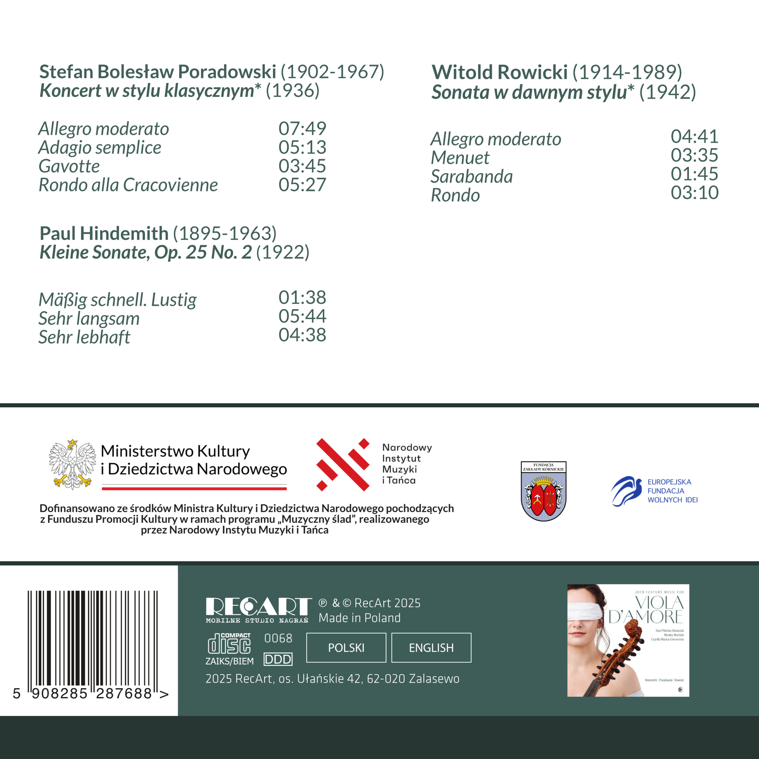 Płyta zawiera napisane w XX wieku kompozycje przeznaczone na violę d’amore w wykonaniu Ewy Pilarskiej-Banaszak. Album otwiera „Koncert w stylu lasycznym op. 10 na violę d’amore i orkiestrę smyczkową” Stefana Bolesława Poradowskiego, w którym solistce towarzyszy Capella Musica Gnesnensis prowadzona od skrzypiec przez Radosława Kamieniarza. Aby ukazać, jak viola d’amore funkcjonowała w Europie w pierwszej połowie XX wieku, kolejną nagraną kompozycją jest „Kleine Sonata, Op. 25, No. 2” Paula Hindemitha. Płytę zamyka „Sonata w dawnym stylu Witolda Rowickiego”, skomponowana w 1942 roku. W tych dwóch utworach solistce towarzyszy przy fortepianie Monika Woźniak.