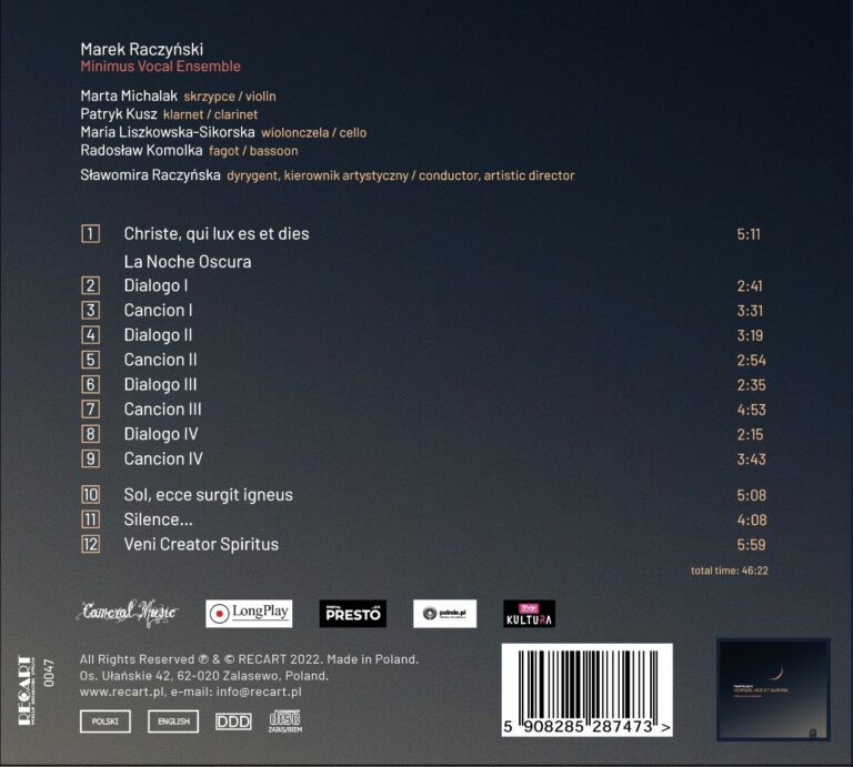 Minimus Vocal Ensemble performing Marek Raczyński’s compositions sounds vibrant and soft. In each of the pieces it prepares us for what is inevitable, because (luckily for us) light possesses this very feature. We wander through the night, clad in sounds, along the astonishing and hesitant verge between evening and morning. We also hope to find a solution to tough and intriguing greys of our daily lives. Thus, the accompanying music brings us both reflection and consolation. On the other hand, gentle consonances with extended tonality naturally support us on our path to a new tomorrow. New meaning better? No matter what, it is certainly worth coming. text by Maja Baczyńska (translated by Maria Mordas)
