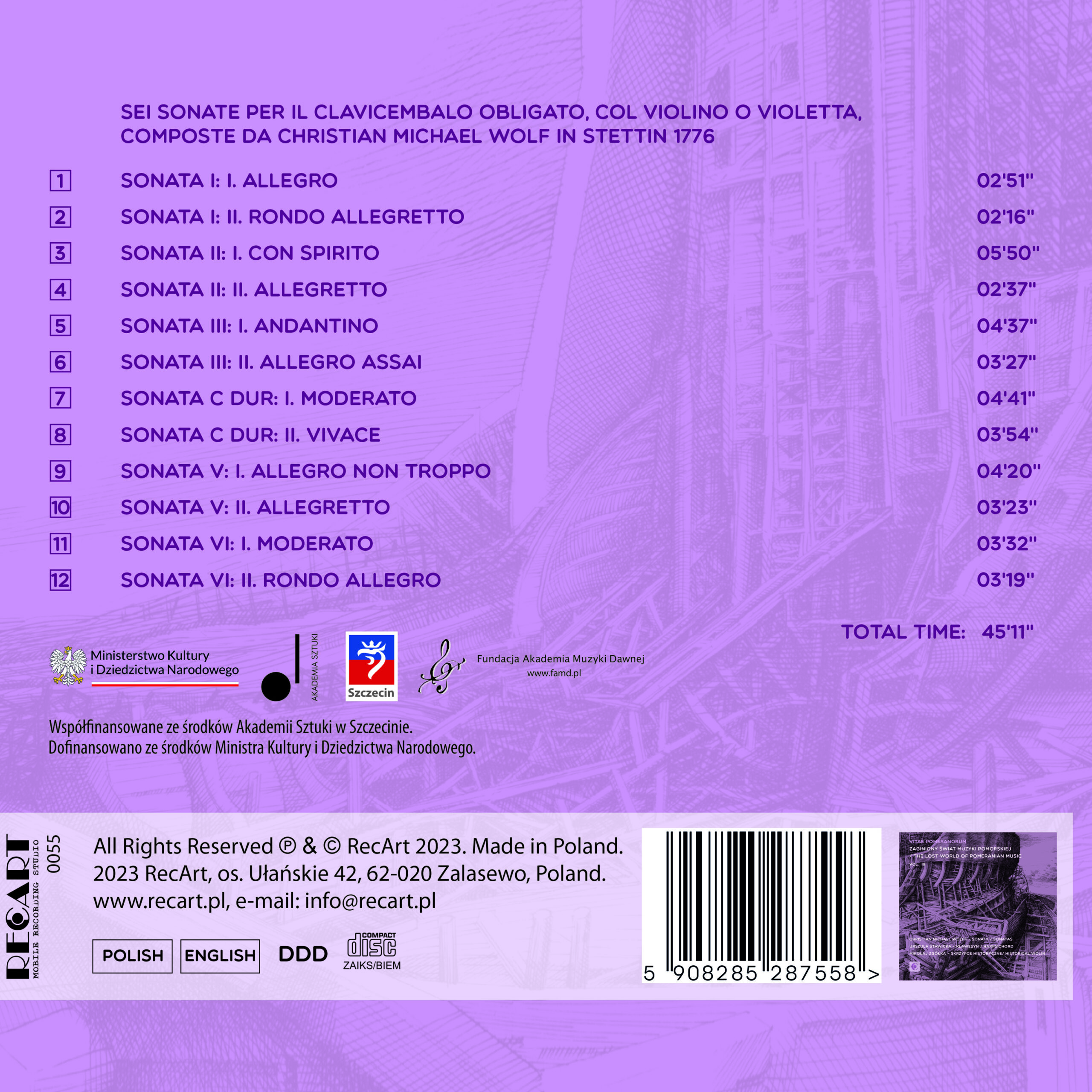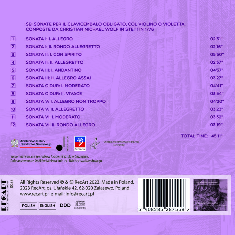 The third album released by Academy of Early Music Foundation (FAMD) and RecArt in the series Vitae Pomeranorum – The Lost World of Pomeranian Music is dedicated in its entirety to the chamber works of Szczecin-based organist and composer Christian Michael Wolff (1707-1789). Born into a famous Pomeranian musical family, he was the son of Christian Friedrich Wolff (d. 1726) and grandson of Friedrich Wolff (d. 1721), both of whom held the post of cantor and music director (Director Musices) at Szczecin’s Church of St Mary (Marienkirche zu Stettin). In the city’s history, the 18th century was not particularly favourable to the flourishing of science, culture, and art (including music). Recorded in the historical interiors of the Przelewice (formerly Prillwitz) Palace, which belonged to the Pomeranian von Schack family in Wolff’s lifetime, Sei Sonate per il Clavicembalo Obligato, col Violino o Flauto Traverso, o Violetta, Composte Da Wolff In Stettin not only testify to the development of chamber music in 18th-century Szczecin, but also provide an opportunity to rescue the now forgotten artist from oblivion. The Sonatas offer proof that Szczecin composers followed the then current European stylistic trends and tendencies. Historically the cycle may be viewed as a perfect bridge between the music of Johann Sebastian Bach and that of Wolfgang Amadeus Mozart. It represents the style of 18th-century Berlin composers, which combined ‘the art of arranging sounds in an ear-pleasing manner’ (J.J. Rousseau) with the emotional and expressive aesthetic of the Sturm-und-Drang period.