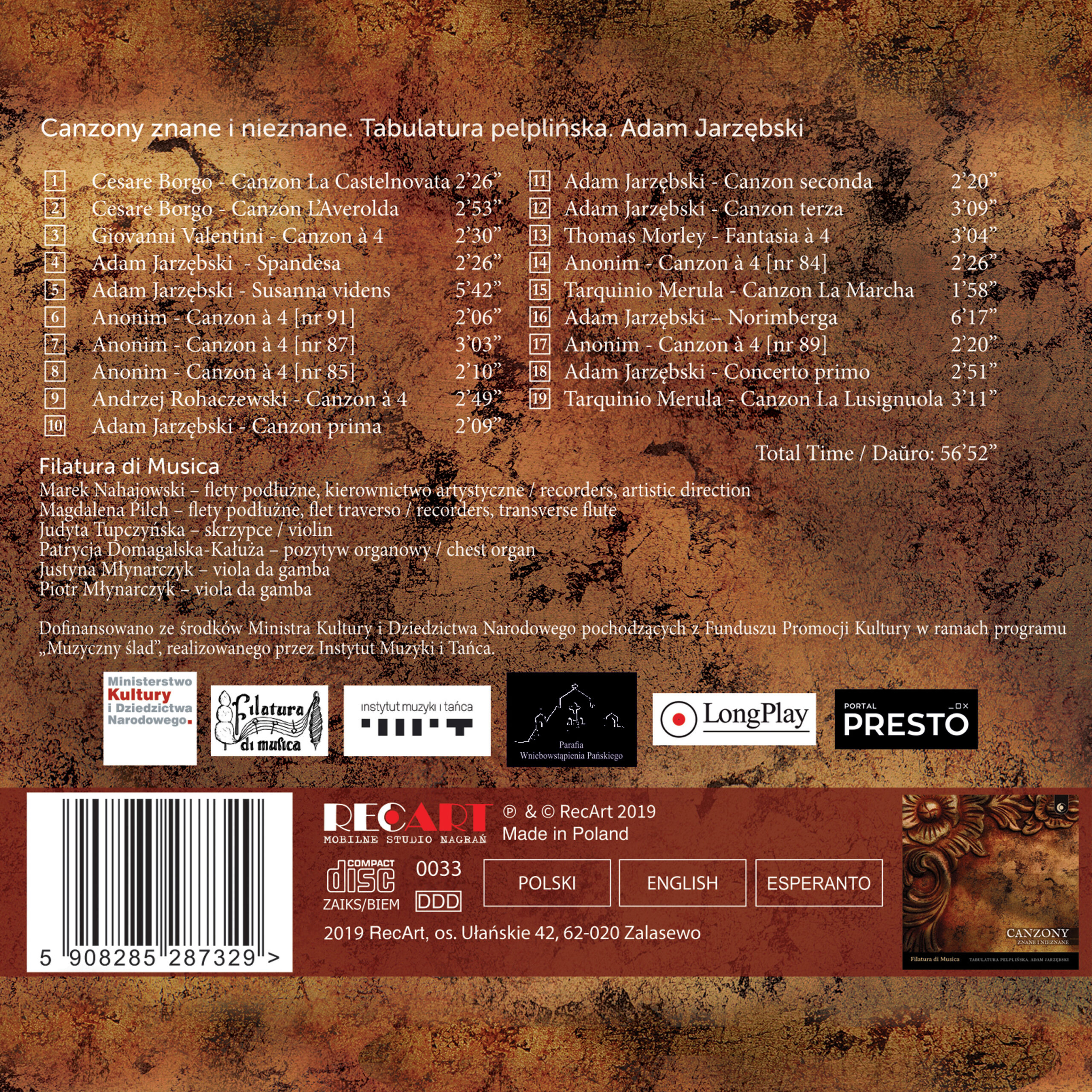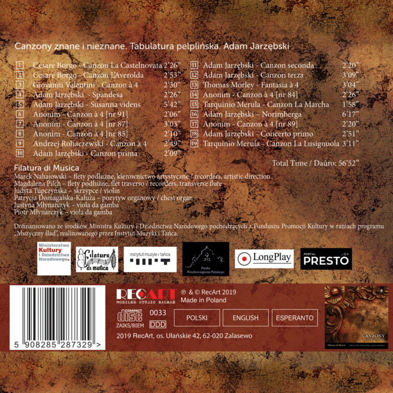 Okres pierwszej połowy XVII wieku można uznać za szczytowy moment rozwoju kultury muzycznej Rzeczpospolitej Obojga Narodów. Wielonarodowe państwo pozostające pod władzą królów z dynastii Wazów (po kądzieli spokrewnionych z Jagiellonami), objęło swoim zasięgiem olbrzymie terytorium – od Wielkopolski, Pomorza i Prus po Inflanty, Ruś i Podole. Płyta „Canzony znane i nieznane – Tabulatura pelplińska – Adam Jarzębski” (RecArt 0033) to pionierska fonograficznie próba ukazania tej różnorodności w sposób świadomy zarówno muzykologicznie jak i wykonawczo.